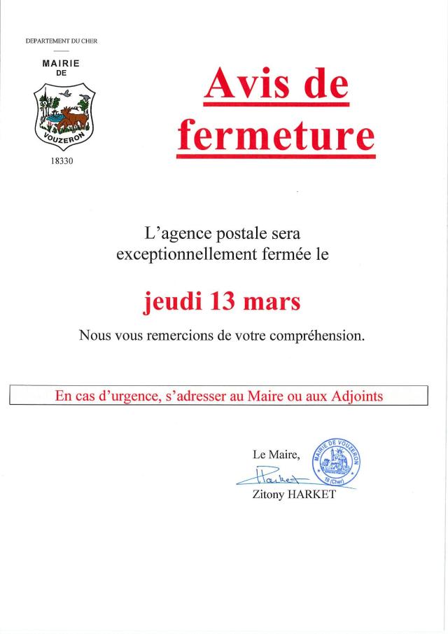 Fermeture exceptionnelle de l’Agence Postale le jeudi 13 mars