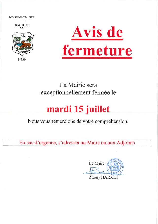 Fermeture exceptionnelle de la Mairie le 15 juillet