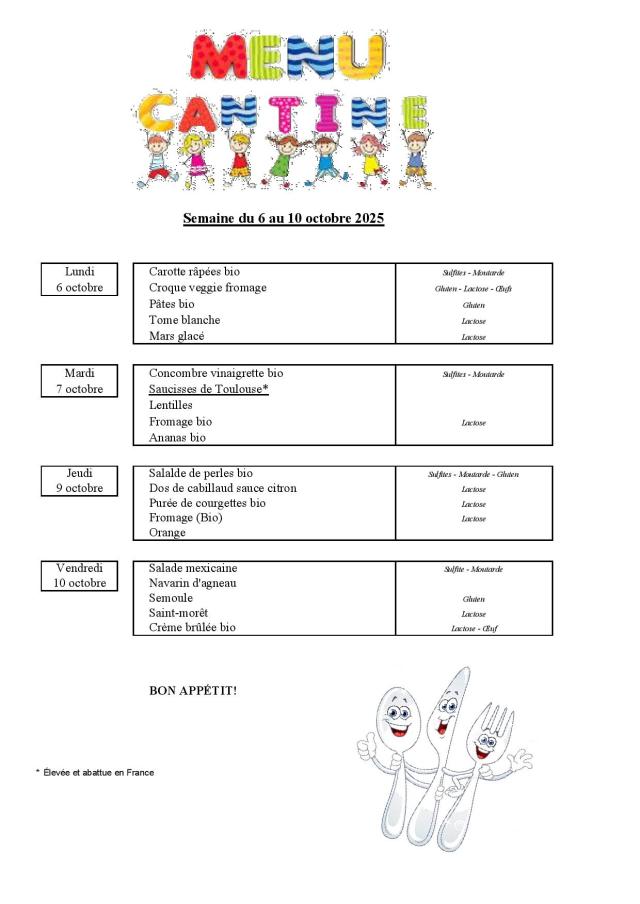 Menu de la cantine scolaire du 6 au 10 octobre