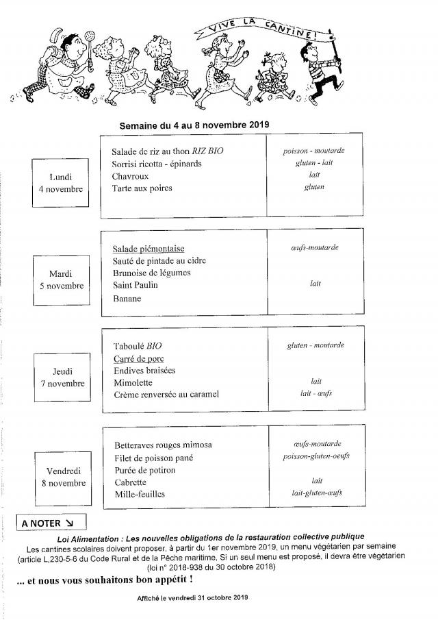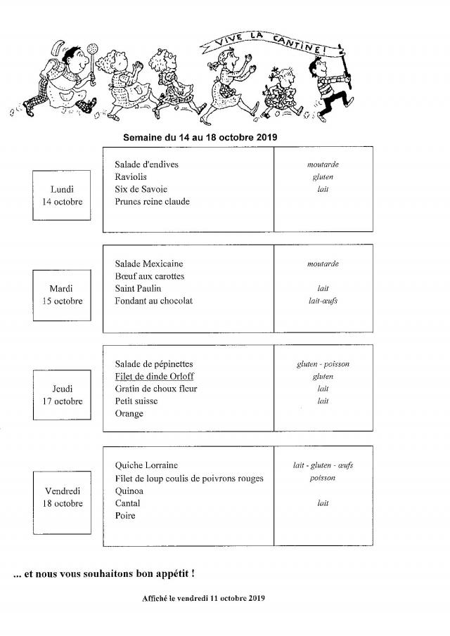 Menu du 14 au 18 octobre 2019 Le octobre 11, 2019octobre 11, 2019 par docprof02dans MENU CANTINE