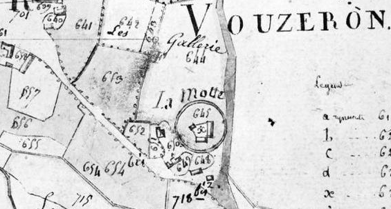 Le chenil du Rallye de Vouzeron occupe le lieu dit « La motte » où se trouvait probablement le château. En 1693, un texte mentionne la présence sur cette motte d’une « maison seigneuriale » entourée de fossés et une basse cour. Une carte du XVIIIème siècle indique la présence de fossés autour de la Motte de Vouzeron. Aujourd’hui en regardant le chenil, il est relativement simple d’imaginer en observant les dénivelés et excavations du terrain, l’emplacement des constructions et l’entrée principale.