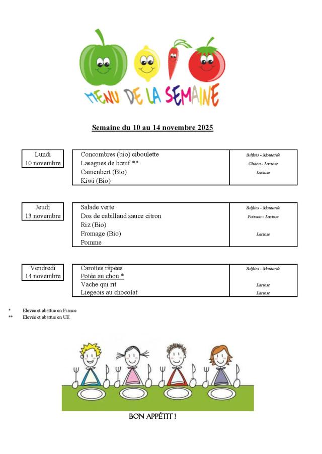 Menu de la cantine scolaire du 10 au 14 novembre 2025 Le novembre 6, 2025 par communevouzerondans MENU CANTINE