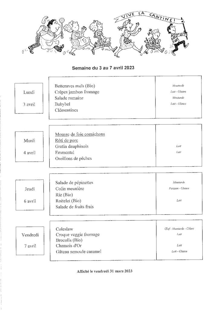 Menu de la cantine scolaire du 13 au 17 mars Le mars 13, 2023mars 13, 2023 par communevouzerondans MENU CANTINE