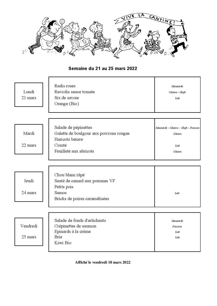 Menu de la cantine scolaire du 21 au 25 mars 2022 Le mars 17, 2022mars 17, 2022 par communevouzerondans MENU CANTINE