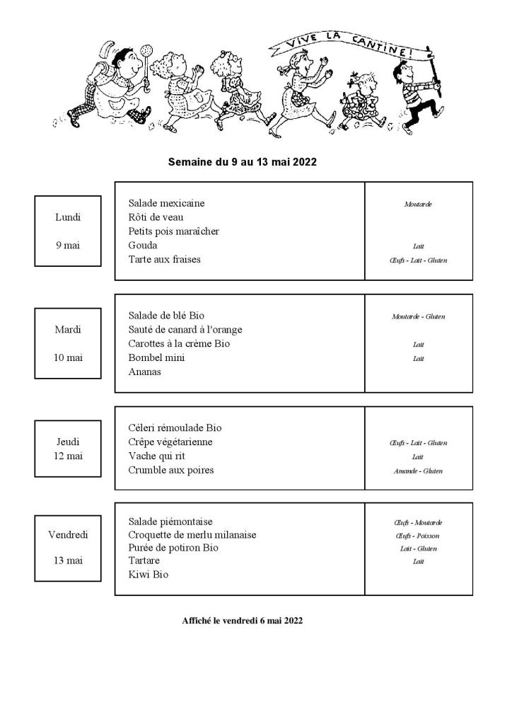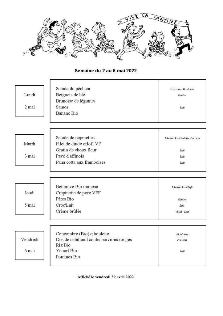 Menu de la cantine scolaire du 2 au 6 mai 2022 Le avril 28, 2022 par communevouzerondans MENU CANTINE