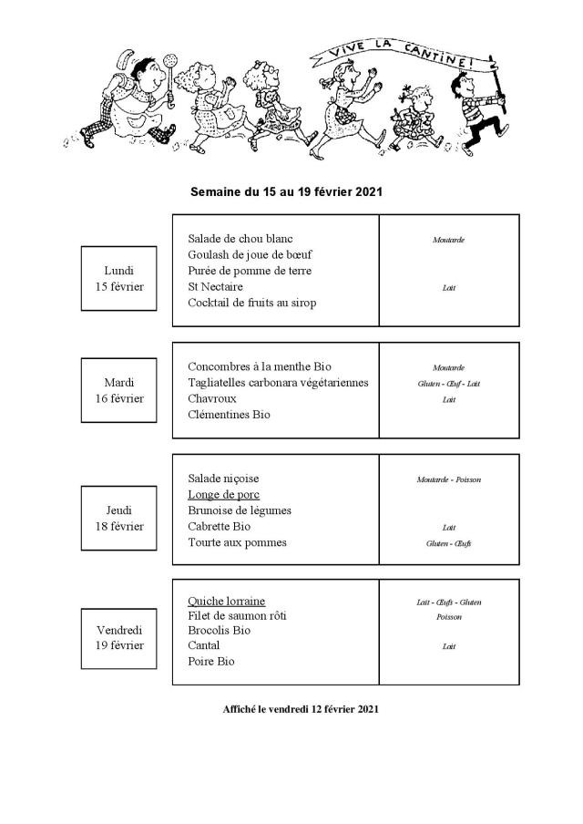 Menu de la cantine scolaire du 15 au 19 février 2021 Le février 12, 2021 par communevouzerondans MENU CANTINE