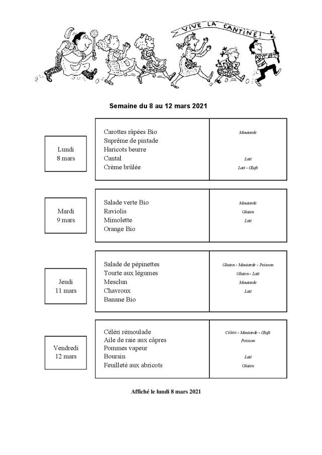 Menu de la cantine scolaire du 8 au 12 mars 2021 Le février 25, 2021 par communevouzerondans MENU CANTINE