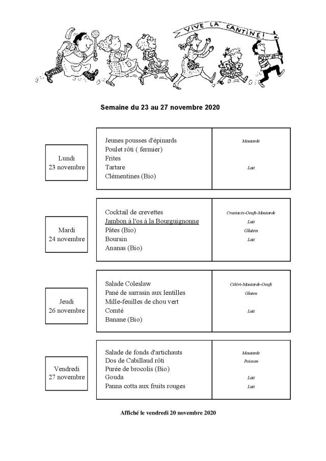 Menu de la cantine scolaire du 23 au 27 novembre 2020 Le novembre 24, 2020 par communevouzerondans MENU CANTINE