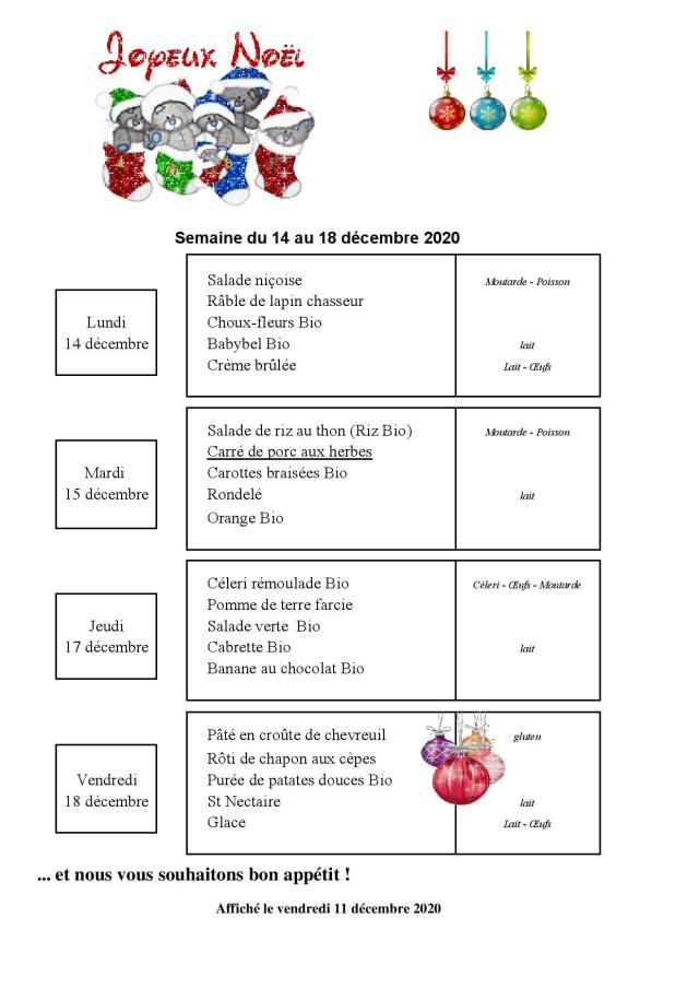 Menu de la cantine scolaire du 14 au 18 décembre 2020 Le décembre 11, 2020 par communevouzerondans MENU CANTINE
